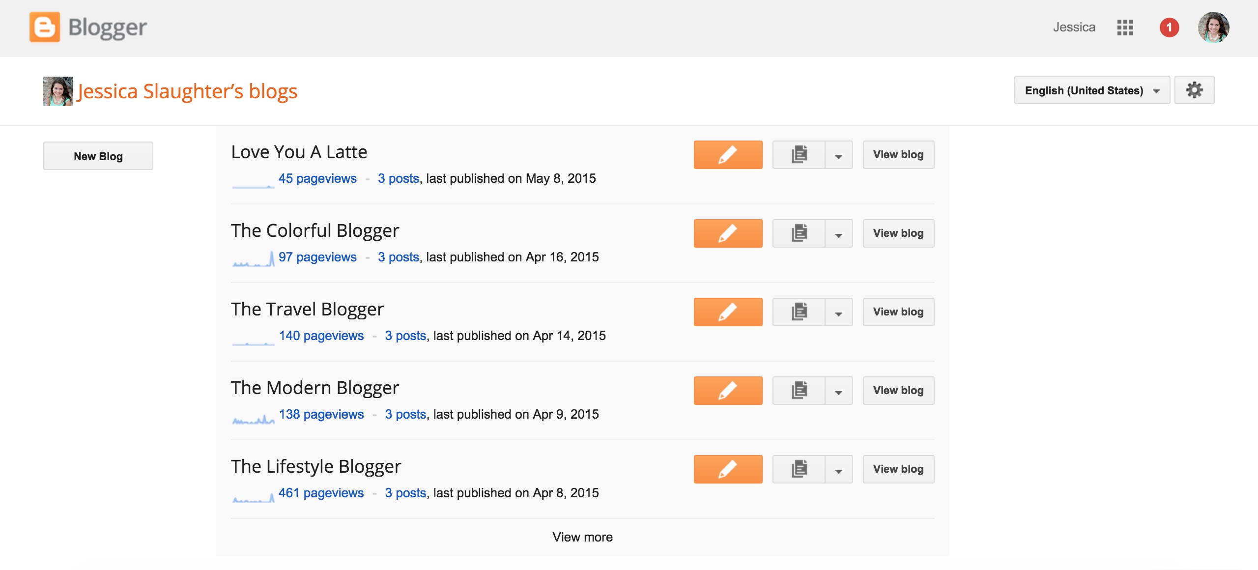 If you already have a Google account, you’re one step ahead! If not, you’ll need to create one by clicking the “Sign Up” button. After that, log in and you should see a page similar to this (I have a lot of test blogs, oops):