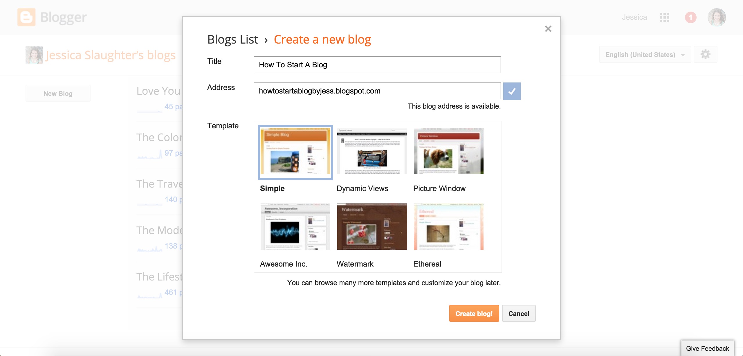 Click “New Blog” and fill in your blog’s title and address. To keep things simple, these names should match, unless an address is taken or your title is extremely long and needs to be shortened for the url. If the address you want is taken, that’s a good sign you should expand a bit and come up with something more unique! I was super annoyed when I found out my own name was taken by a blog whose last update was in 2010, but some things aren’t meant to be!