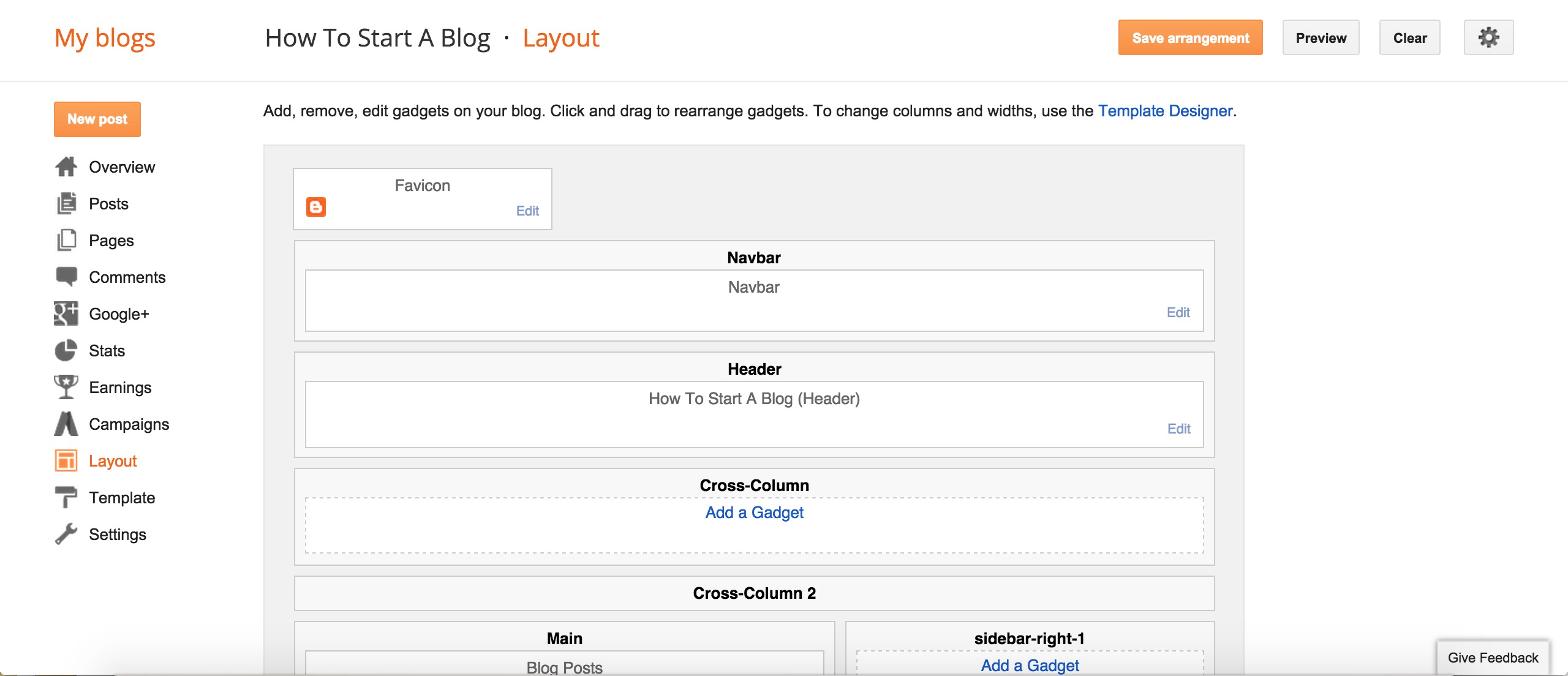 The layout page gives you a skeleton view of your blog and allows you to edit your widgets. A widget is like an extra function box for your blog; there are text box widgets, picture widgets, and even HTML widgets that give you tons of freedom for placing cool stuff on your blog.